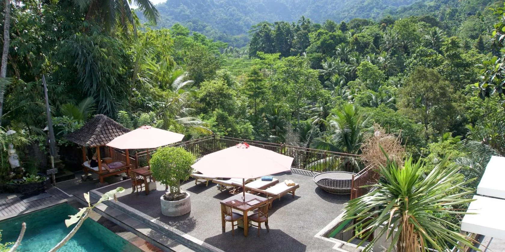 Surrounded by rice fields, Abian Ayu Villa offers a tranquil getaway with stunning views of Mount Agung. Guests can have a relaxing dip in the outdoor pool overlooking the rice terraces.