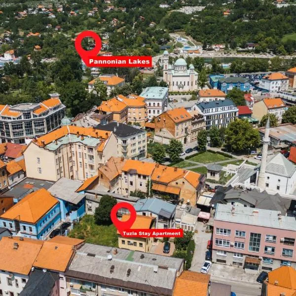 Nằm ở Tuzla, cách Hồ Pannonica Salt Lakes 6 phút đi bộ, Tuzla Trg - Tuzla Square cung cấp Wi-Fi miễn phí và nhìn ra thành phố.