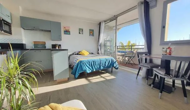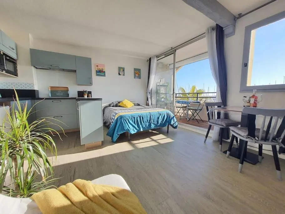 Set in Gruissan, 300 metres from Grazel and 30 km from Reserve Africaine de Sigean, Grand Studio à 300m de la plage dans Résidence calme - une seule pièce offers a terrace and air conditioning.