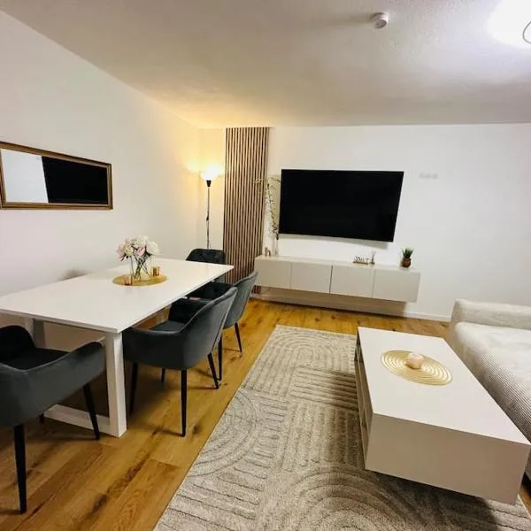Situated in Langensteinbach in the Baden-Württemberg region, Modernes und gemütliches Designerzimmer features a terrace and garden views. Guests can benefit from a patio and a children's playground.