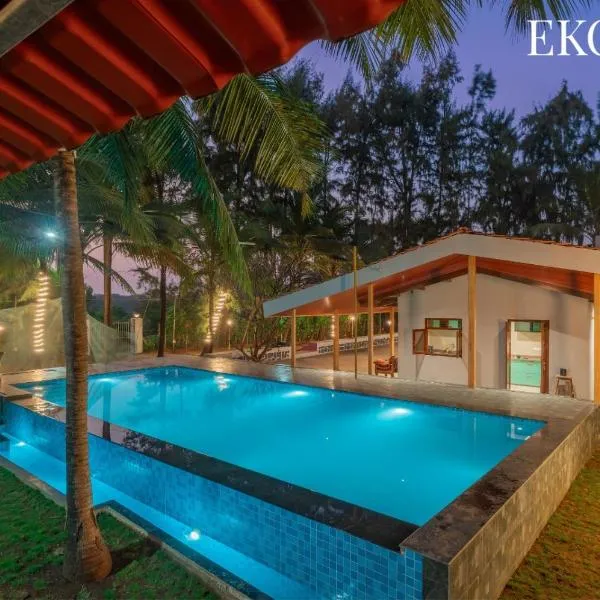 Với hồ bơi ngoài trời, khu vườn, cùng sân hiên, SaffronStays Ekaant- 3BR pet-friendly pool villa with lawn, games & river walk in gated community near Mumbai cung cấp chỗ nghỉ ở Pālghar có Wi-Fi miễn...