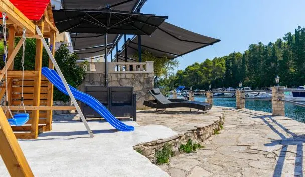 Tara's Lodge tilbyder udendørs swimmingpool med solterrasse ved stranden i Korčula. Der er værelser med aircondition og gratis wi-fi samt restaurant med terrasse kun meter fra havet på stedet.
