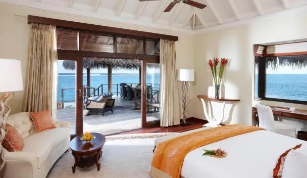 White sands, crystal waters and gold sunshine feature at the luxurious Sheraton Maldives Full Moon Resort & Spa & Spa & Spa on the private Furanafushi Island in North Male Atoll, Maldives.