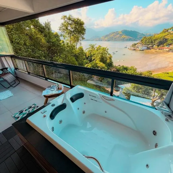 Boasting mountain views, Loft luxo à beira-mar com hidromassagem features accommodation with a private beach area, a garden and a terrace, around a few steps from Biscaia Beach.