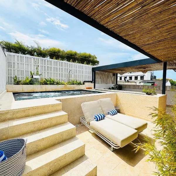 Luxury Apartment Private Pool & Rooftop Jacuzzi está ubicado en el centro de Cartagena de Indias y ofrece alojamiento con un gimnasio, vista a la ciudad, una terraza y parrilla.
