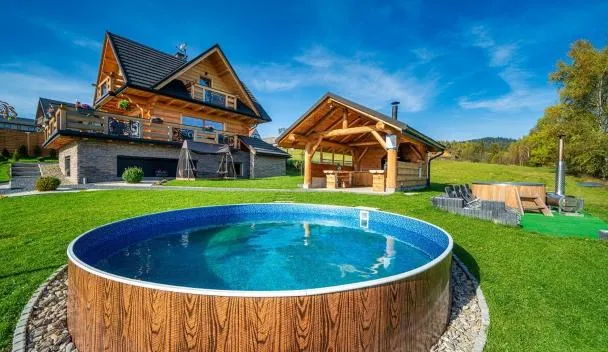 Tọa lạc ở Nowy Targ, Domek w górach DeLuxe sauna, jacuzzi,basen,hot tub-Nowy Targ blisko Białka, Zakopane có ban công nhìn ra núi và hồ bơi, cũng như hồ bơi ngoài trời mở theo mùa, phòng xông hơi khô...