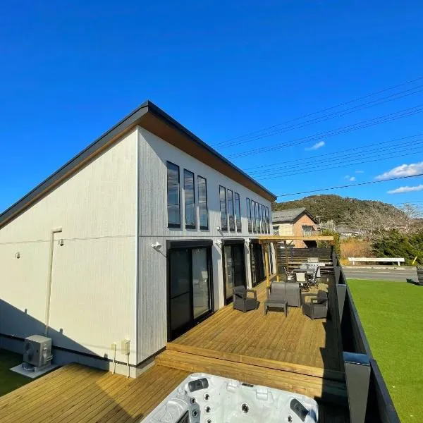Apresentando bicicletas gratuitas, um jardim e um terraço, ロウリュウサウナとアイスバスのあるラグジュアリー貸別荘 fornece acomodações em Hōjō com acesso Wi-Fi gratuito e vista do mar.