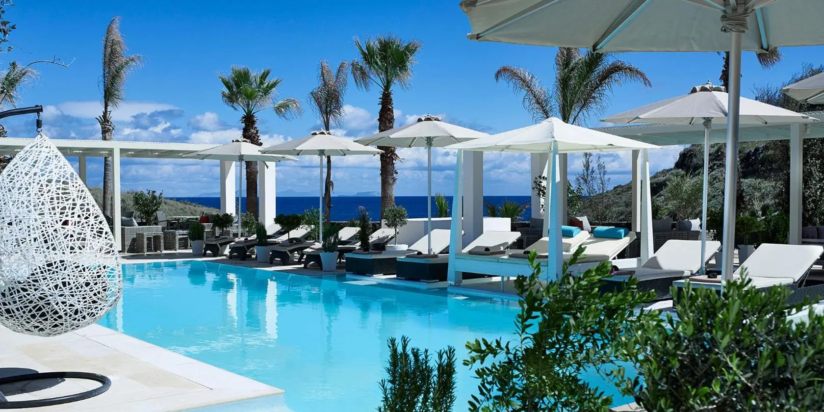Perched on the cliffs of Imerovigli, Avista offers Cycladic-style suites in minimal decor overlooking the caldera and the volcano.
